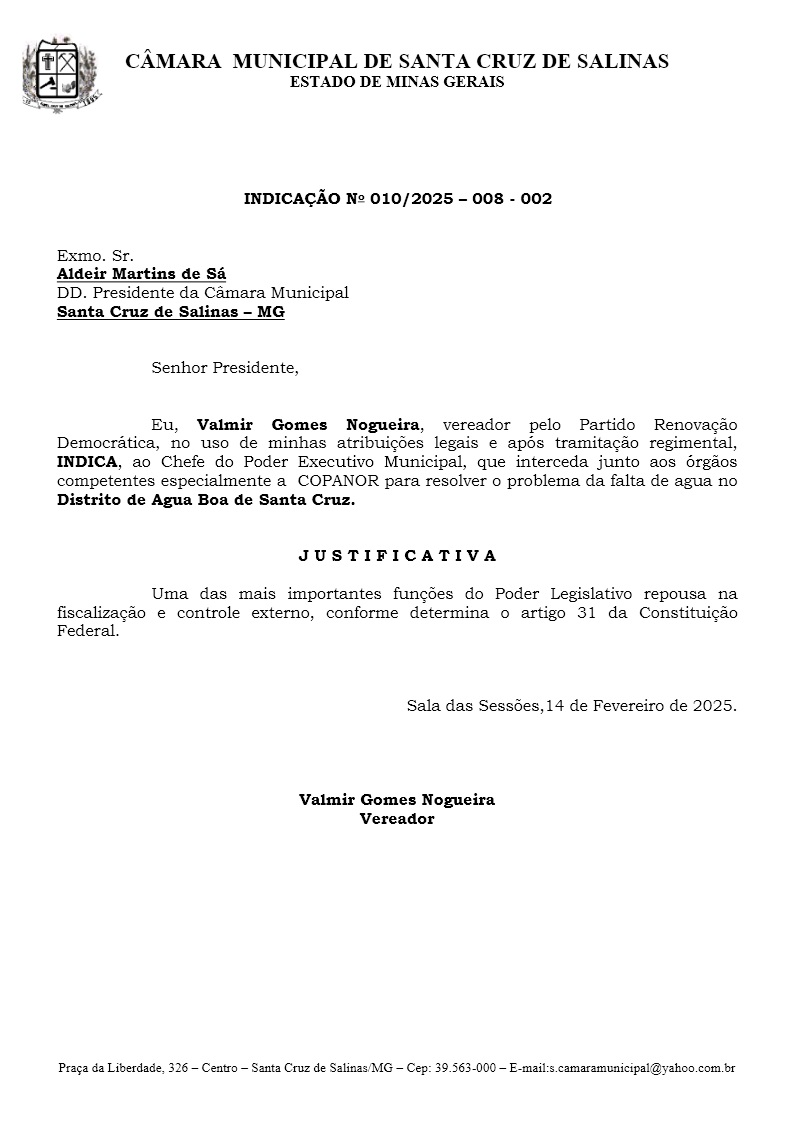 Ementa / Resumo Interceder junto à COPANOR para resolver problema de falta de água no Distrito de Água Boa.