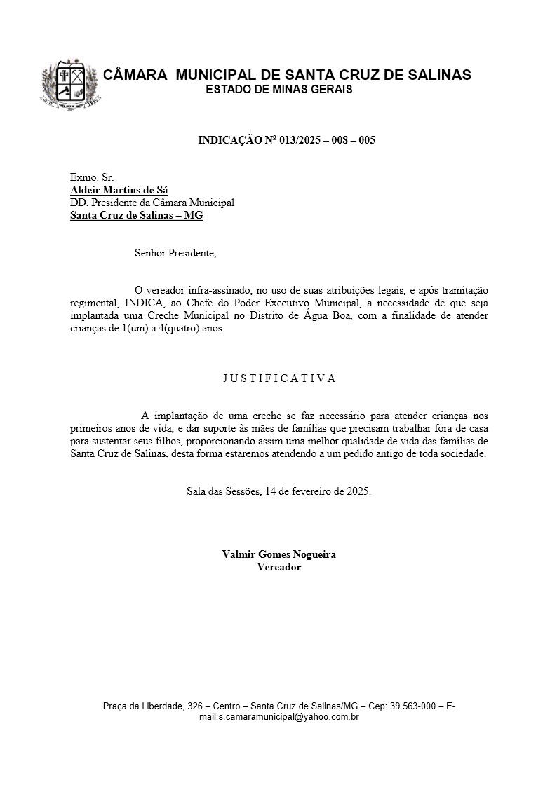 Implantação de Creche Municipal no Distrito de Água Boa para crianças de 1 a 4 anos.